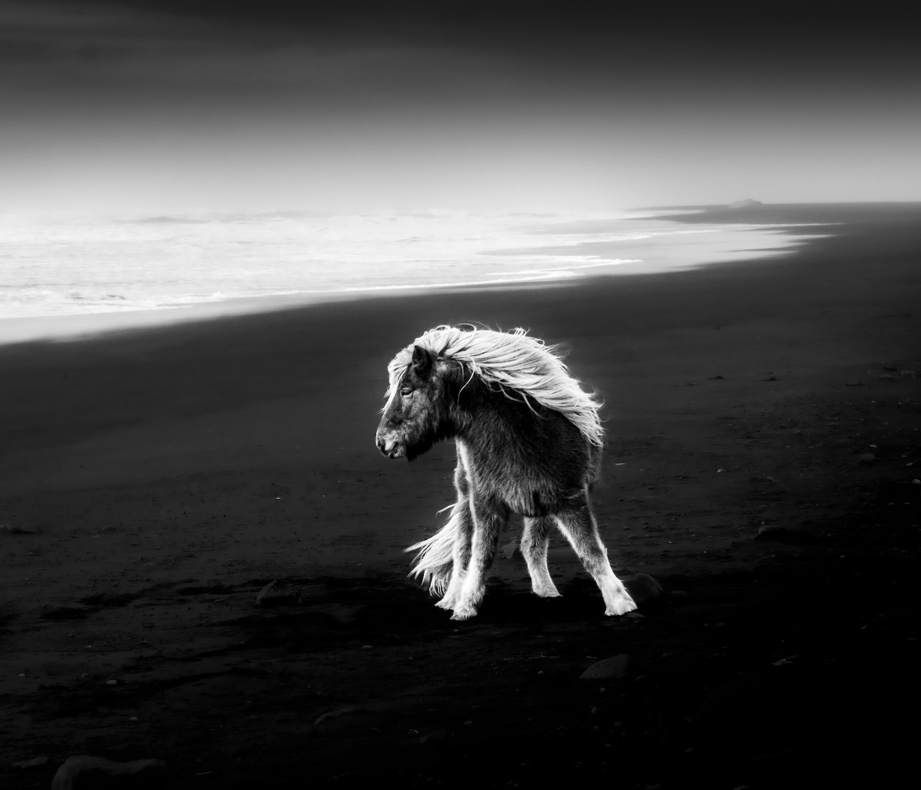 Photographer statement – Into the Gale. An Icelandic horse facing into the gale on a black sand beach.
