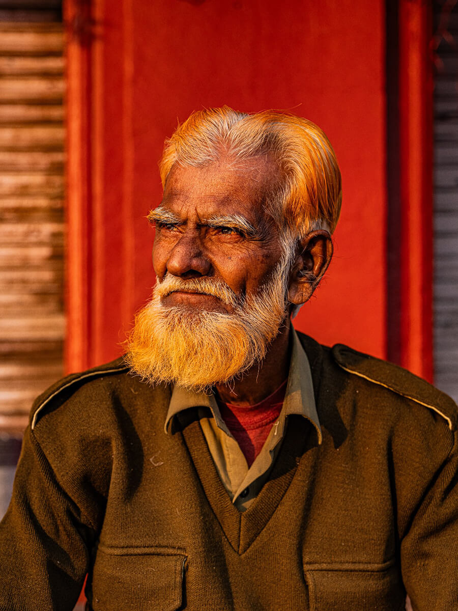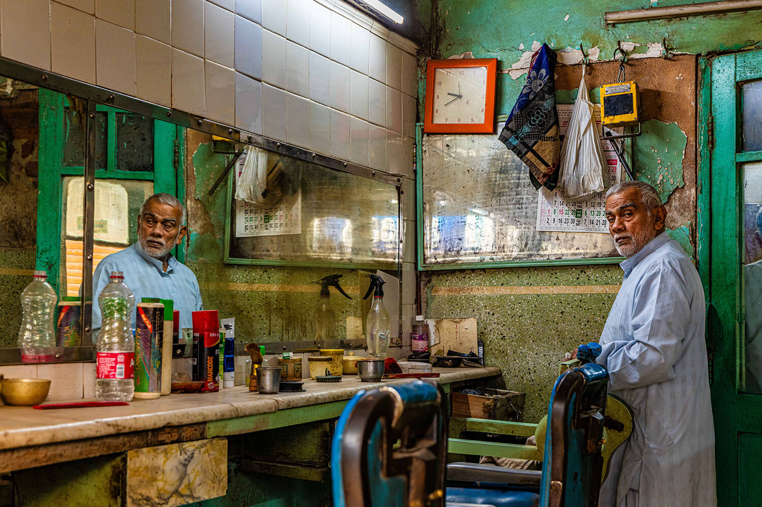I also love the barber shop portrait [below]. The colors, the worn walls, the mirrors, the light – everything felt like a small time capsule. The barber had been practicing for decades, and the scene had that feeling you get in India sometimes, where you turn a corner and it feels like you’ve stepped into another era. Not as nostalgia, but as continuity.